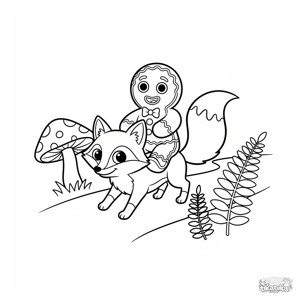 Simple coloring page for toddlers 2-3 years: the gingerbread man from the fairy tale riding a fox through the forest. Large figures, very simple details, wide margins.