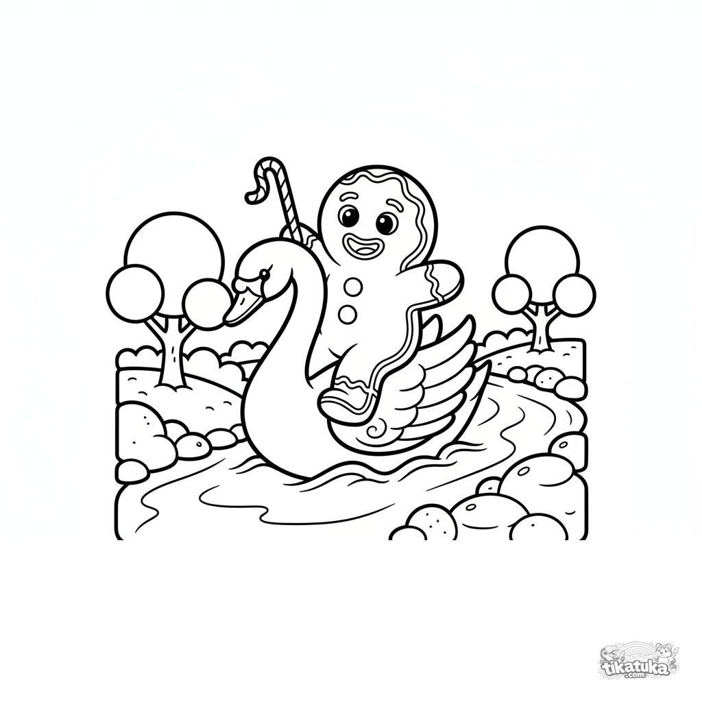 Easy coloring page for toddlers: a gingerbread man riding a frosting swan down a milk river past candy landscapes. For kids aged 2-5.