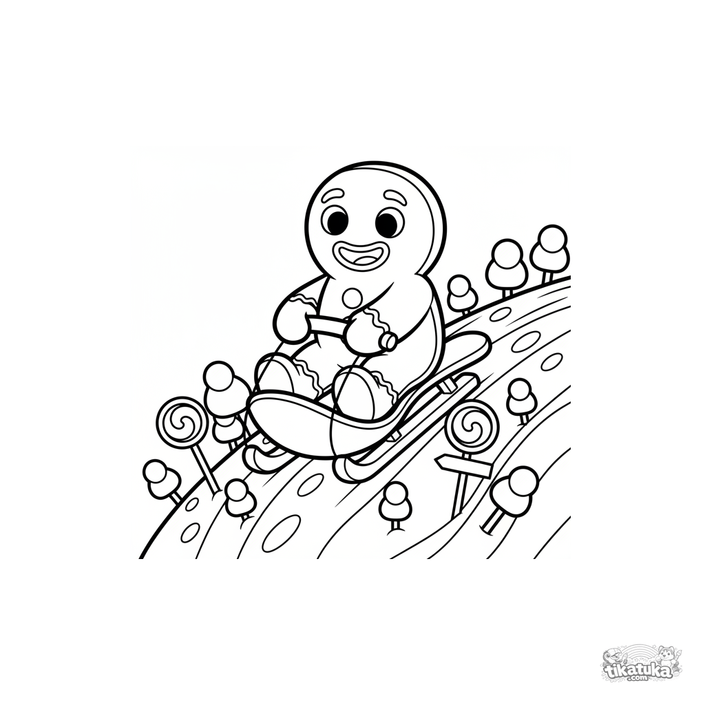 Simple coloring page for toddlers: a gingerbread man sledding on a spoon down an icing hill. For kids aged 2-5. A fun, candy-themed fairy-tale environment.