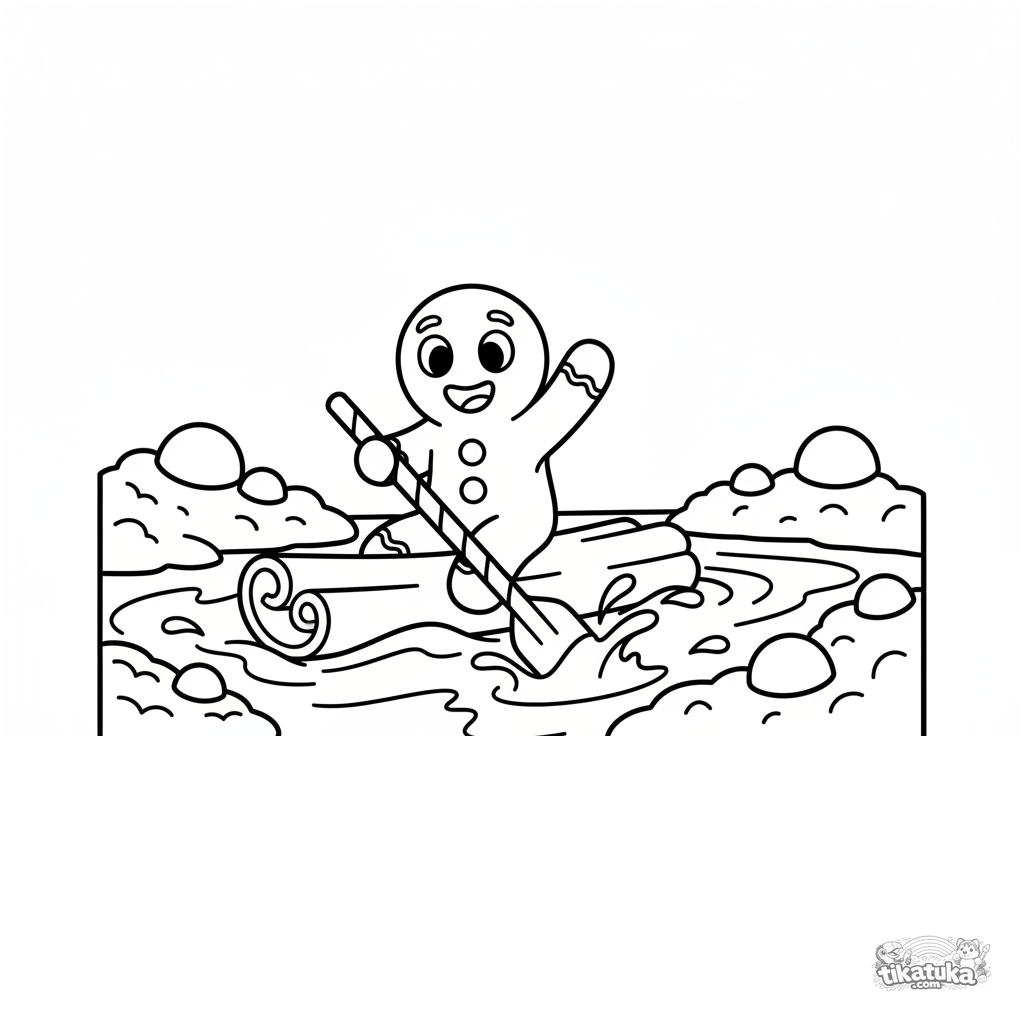 Simple toddler coloring page of a happy gingerbread man riding a cinnamon stick boat down a milk river. For ages 2-3, with large, easy-to-color shapes.