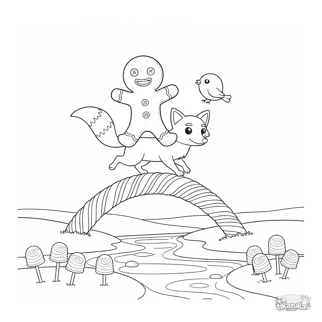 Fairy tale coloring page: a gingerbread man rides a fox across a candy cane bridge. For kids aged 6-9. Scene with a chocolate milk river and gumdrop bushes.