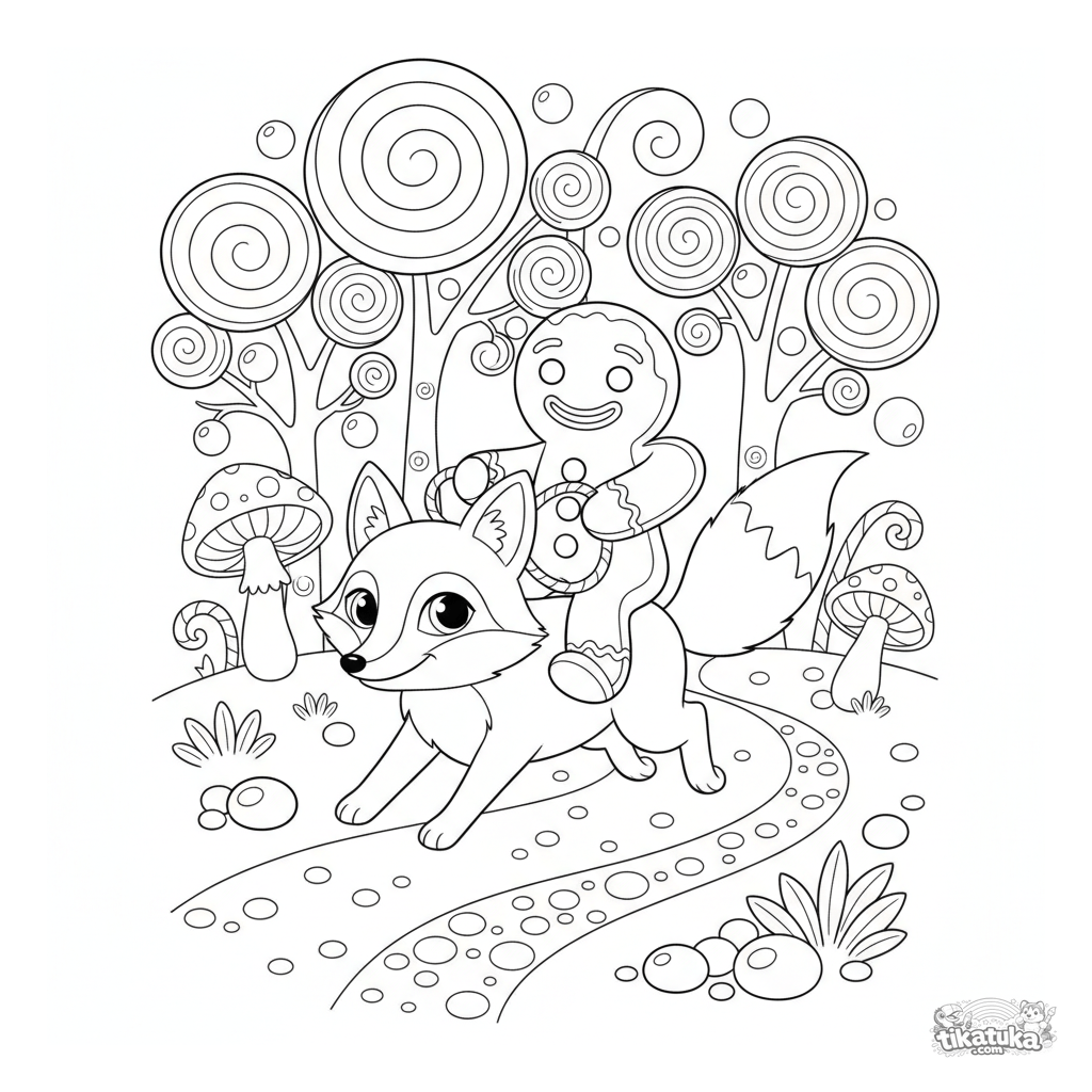 Fairy tale coloring page: a gingerbread man rides a fox through a magical candy forest. For kids aged 5-8. A sweet and fun scene.