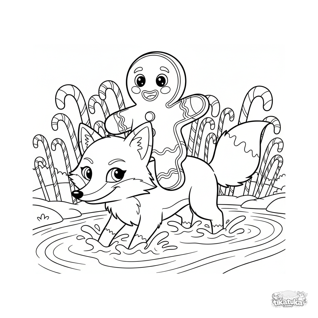 Coloring page from the fairy tale: the Gingerbread Man riding a fox across a river of milk. For ages 6-9. He holds the fox's fur, with candy cane reeds on the riverbank.