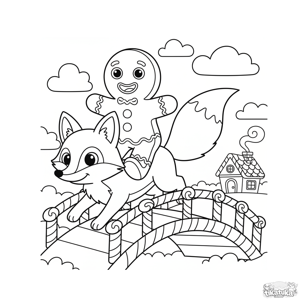 Simple fairy tale coloring page: a gingerbread man rides a fox across a candy bridge. For toddlers aged 2-5. Large details, thick outlines.