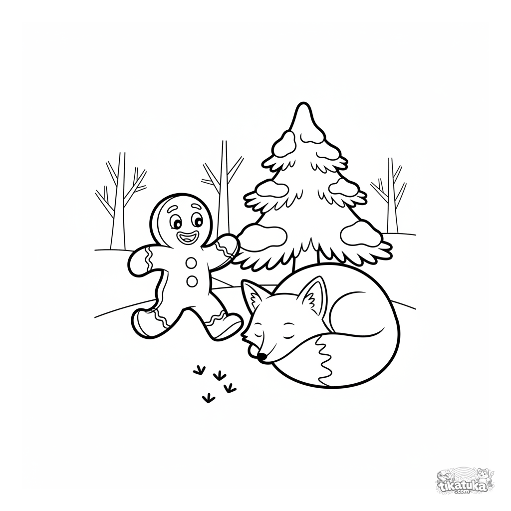 Fairy tale coloring page for kids 4-6: the lively Gingerbread Man runs past a sleeping fox in a snowy winter forest. A wintry, dynamic, and recognizable scene to color.