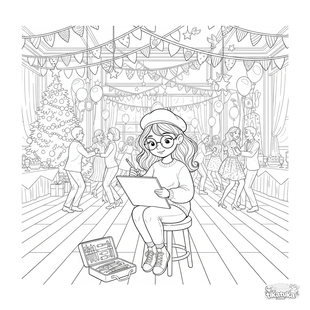 Coloring page for older kids 10-12: a girl artist sketches party guests in a decorated festive hall. High detail, layered scene, expressive line work.