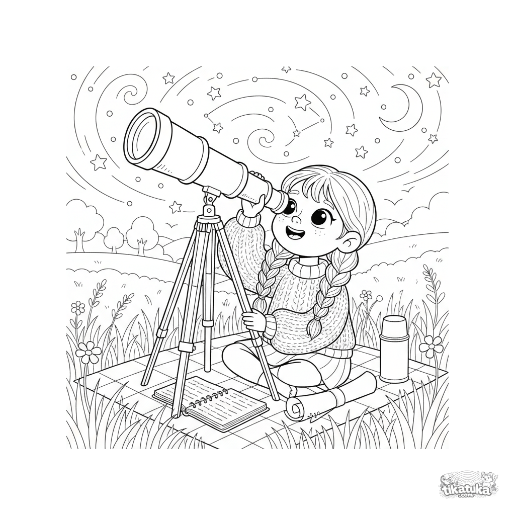 Coloring page for kids 5-8: a girl astronomer peers with curiosity through a telescope at the stars at dusk. A scene with details for creative coloring.