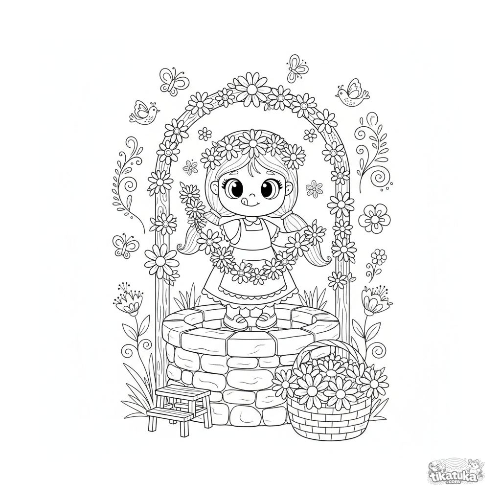 Bright coloring page for kids 4-6: a girl prepares the well for a festival by decorating it with a flower garland. Clear outlines, folk patterns, cheerful scene.
