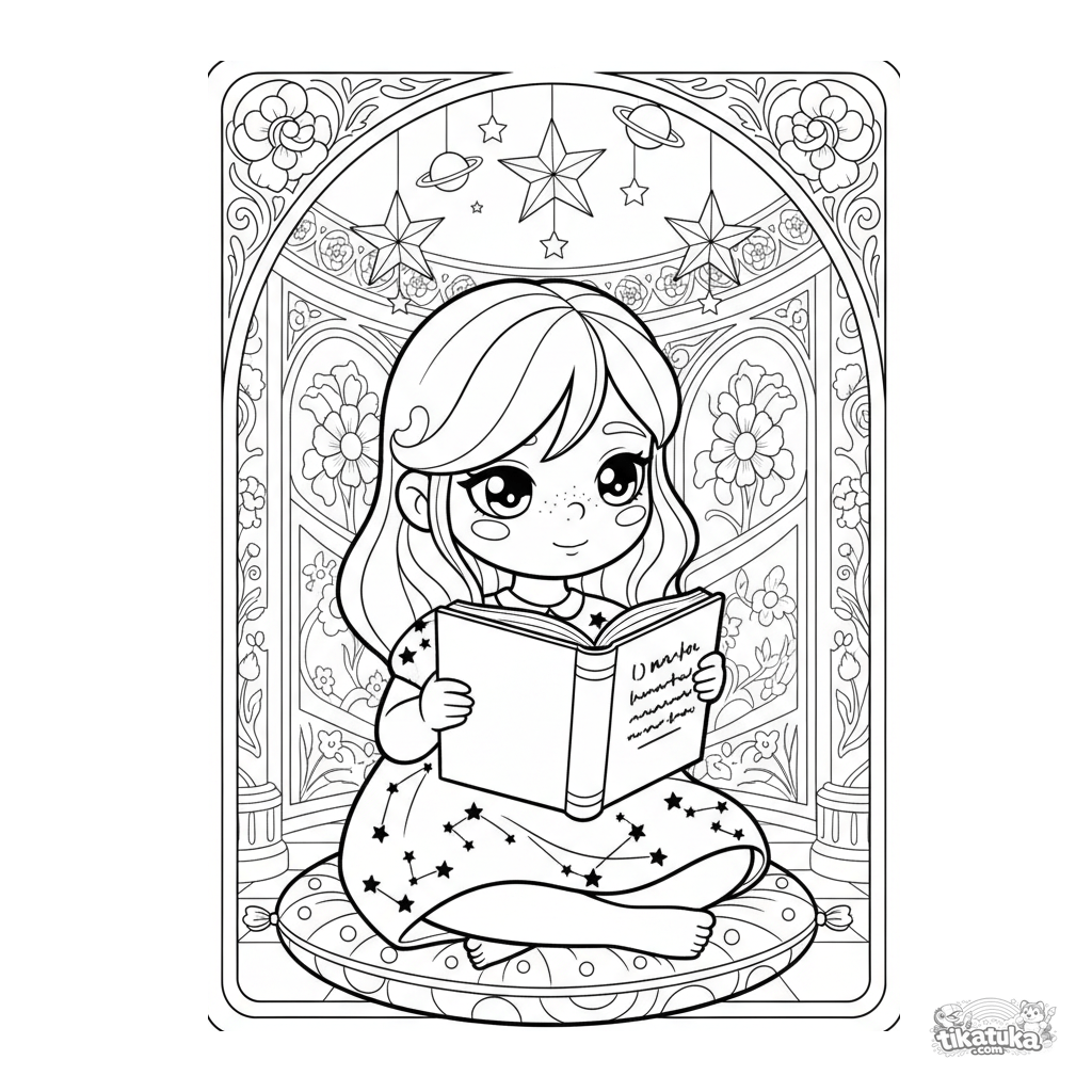 Coloring page for girls 7-9: a girl dressed as a constellation reads a book under hanging paper stars in a festive hall. Moderate detail.