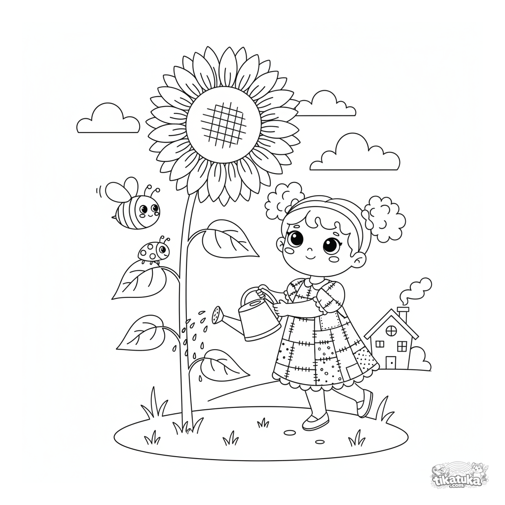 Coloring page for girls 4-6: a cheerful girl in a dress waters a giant sunflower with a watering can. A cute and simple scene for motor skills development.