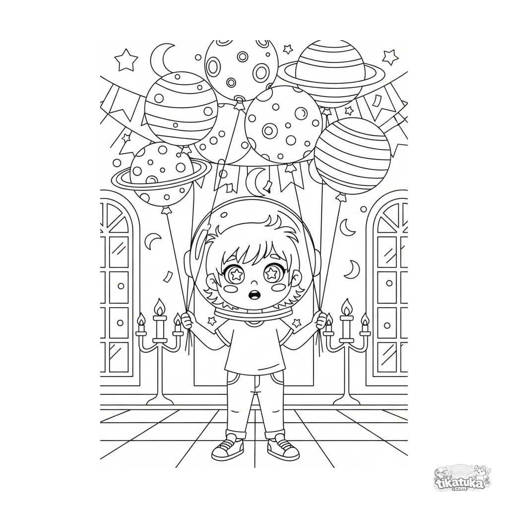 Coloring page for kids 4-6 years: a girl in an astronaut helmet holding planet balloons in a festive hall. Clean flat shapes, clear scene, full figure.