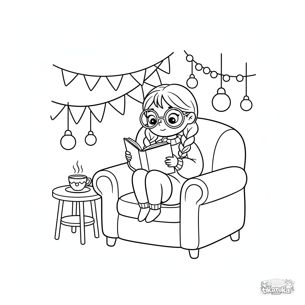Coloring page for kids 7-9 years: a girl with glasses and a sweater is curled up in an armchair in a festive hall, deeply reading a big book.
