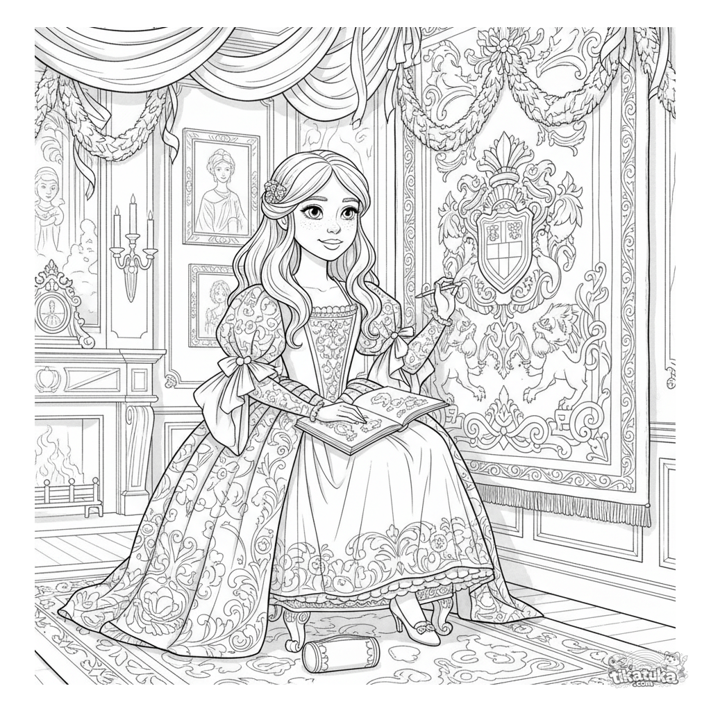 Complex coloring page for kids 10-12: a girl in a historical dress sketches the decorations of a ballroom. Detailed outlines, creative atmosphere.