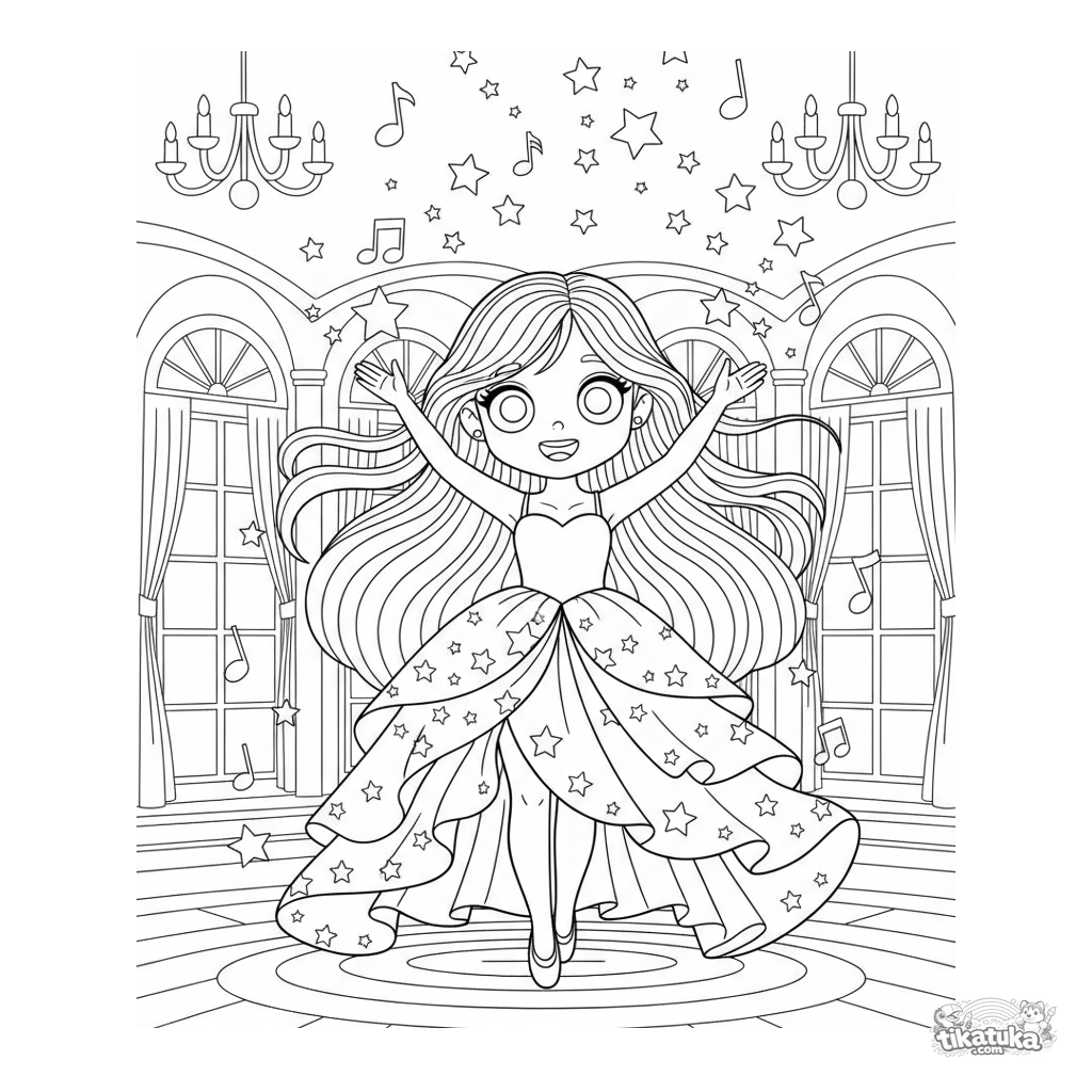 Coloring page for tweens 7-9: a girl in a magical dress conducts sparkles and music notes in a festive hall. Expressive pose, moderate background.