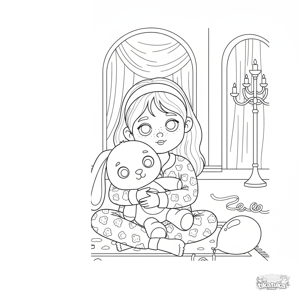 Coloring page for kids 4-6: a girl in cozy pajamas sits on the floor of a festive hall with a stuffed bunny after the party. Simple scene, clear shapes.