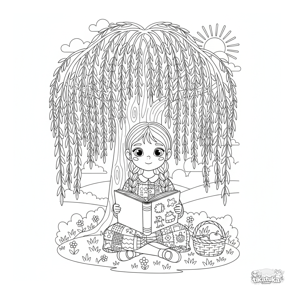 Coloring page for girls: a girl in a patchwork dress reads a book under a willow tree. For ages 5-8. A peaceful scene with engaging details to color.