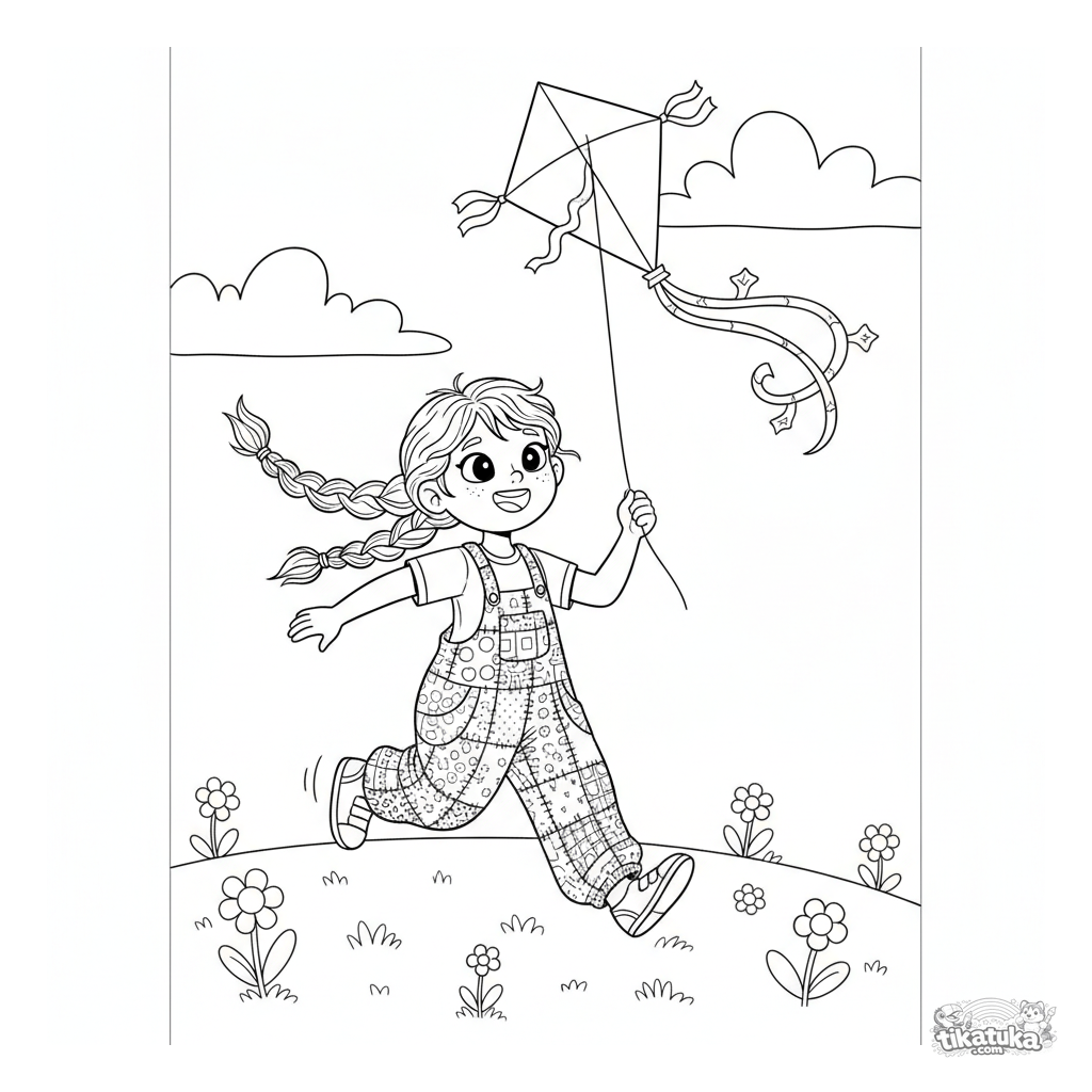 Coloring page for girls: a cheerful girl in overalls flies a kite on a windy hill. For kids aged 3-6. Simple lines, flowers, and clouds.