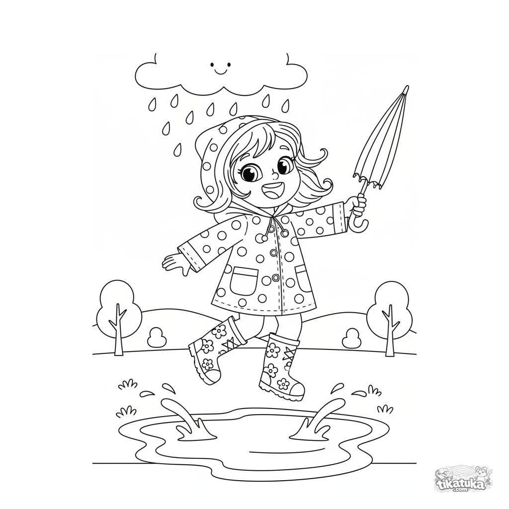 Kids coloring page: a happy girl in a raincoat jumps in a puddle. Balanced detail, suitable for ages 4-6.