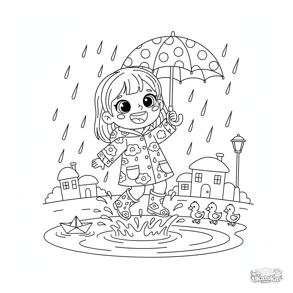 Fun coloring page of a girl in a raincoat jumping in a puddle on a rainy day. For kids aged 5-8. Features an umbrella, ducklings, and a paper boat.