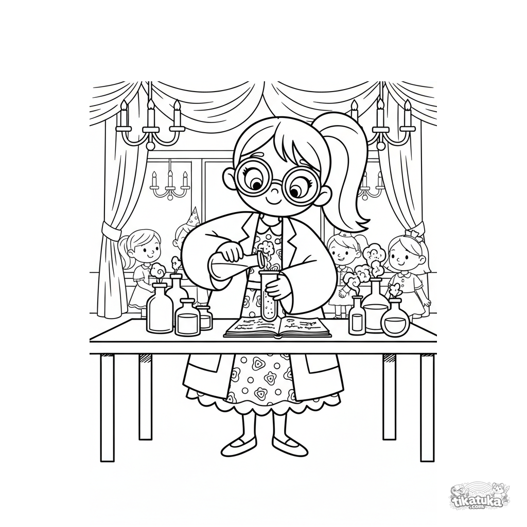 Coloring page for tweens 7-9: a girl in a lab coat conducts a fun potion experiment at a table in a festive hall. Dynamic scene.