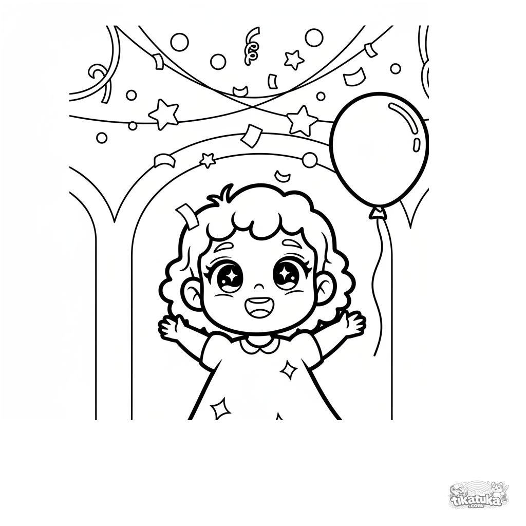 Toddler coloring page 2-3: a girl in sparkles watches falling confetti in a festive hall. Huge simple shapes, minimal detail, very wide margins.
