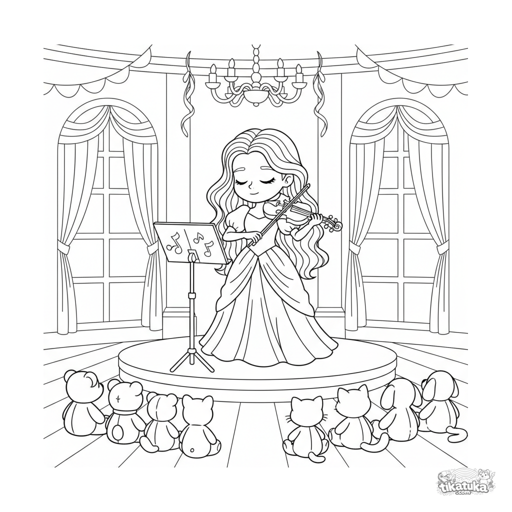 Coloring page for tweens 7-9: a girl performs a melody on the violin on a small stage in a festive hall. Graceful lines, expressive pose, moderate details.