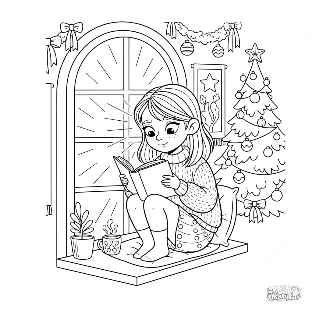 Coloring page for girls 7-9: a girl in a cozy sweater reads a book in a cushioned window nook inside a festive hall. A cup and plant are on the windowsill.
