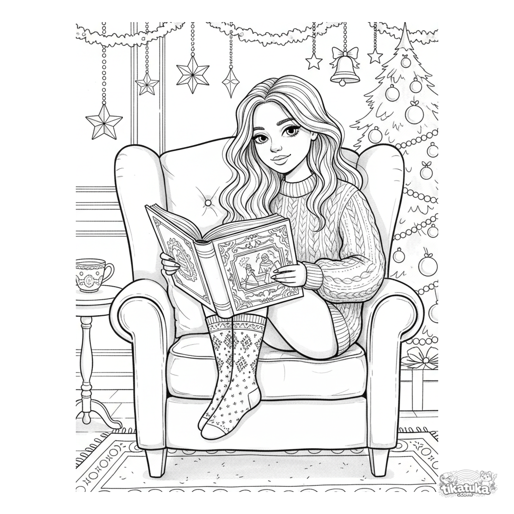 Coloring page for older kids 10-12: a girl reading a giant book in a cozy nook of a festive hall. Detailed scene with armchair and interior details.