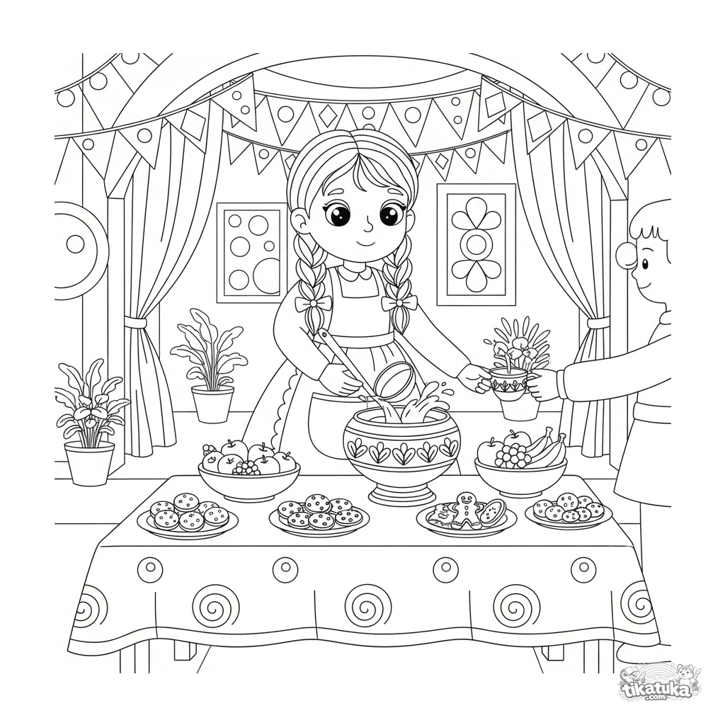 Coloring page for kids 4-6: a girl in an apron serves punch to guests in a decorated festive hall. Clear shapes, understandable action, moderate details.