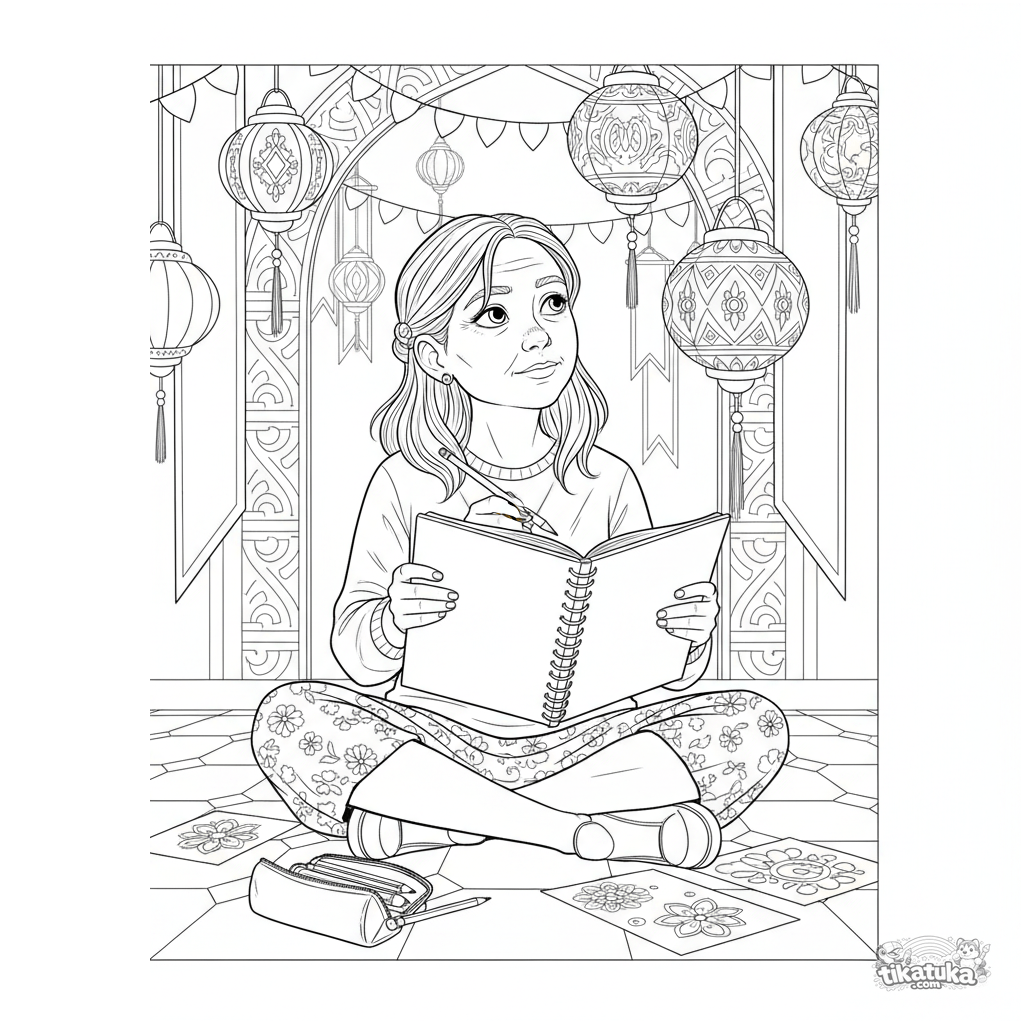Coloring page for kids 10-12 years: a tween girl sits on the floor of a festive hall, sketching decoration ideas in a large sketchbook. Detailed scene.