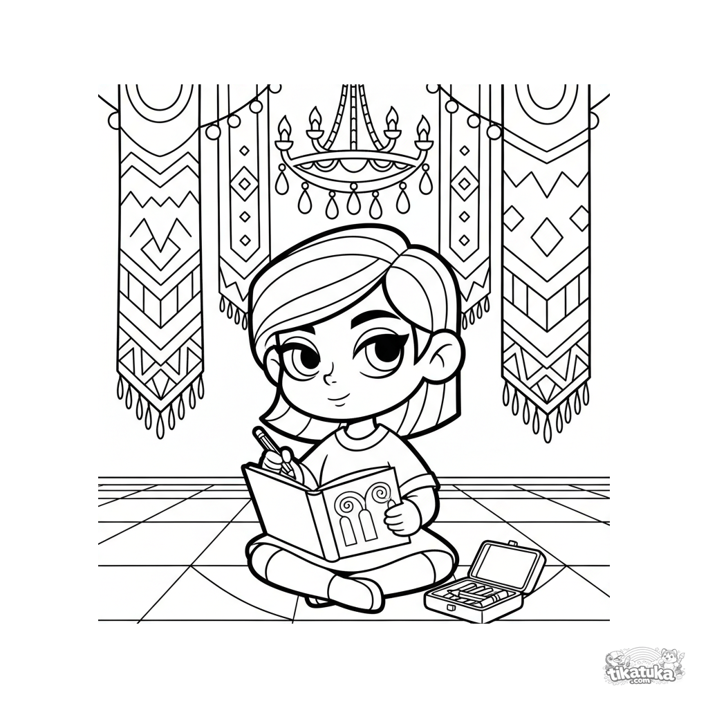 Coloring page for tweens 7-9: an artistic girl sketching the decorations of a festive hall in her sketchbook. A creative scene with a pencil case.