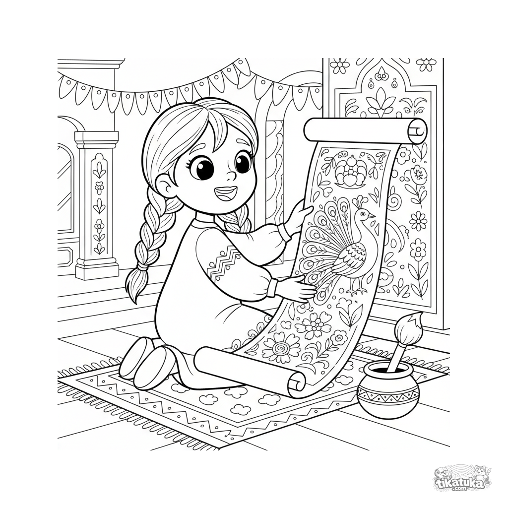 Coloring page for kids 7-9: a girl in a folk style unrolls a long decorative scroll in a festive hall. Patterned details to color.