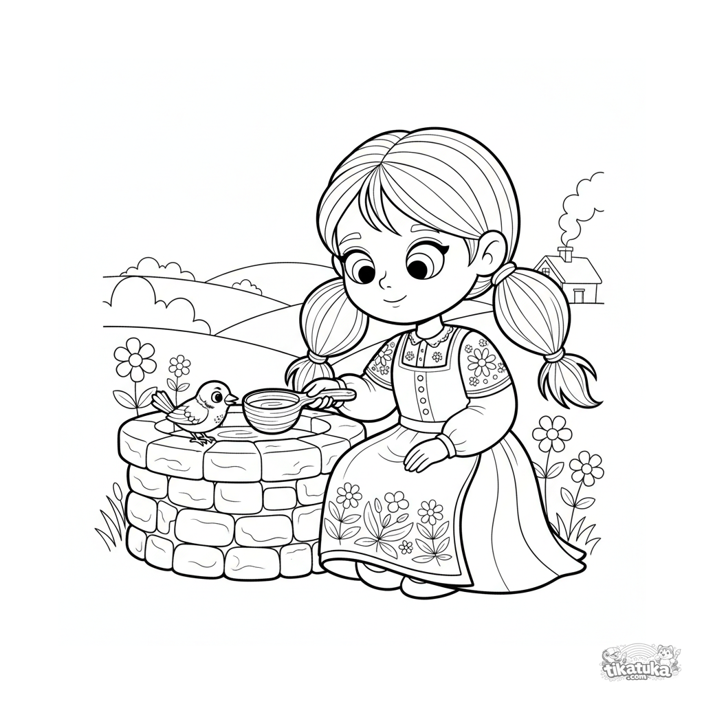 Coloring page for tweens 7-9: a girl in a folk dress gives a sparrow a drink from the well. Warm storybook style, scene of friendship and care.