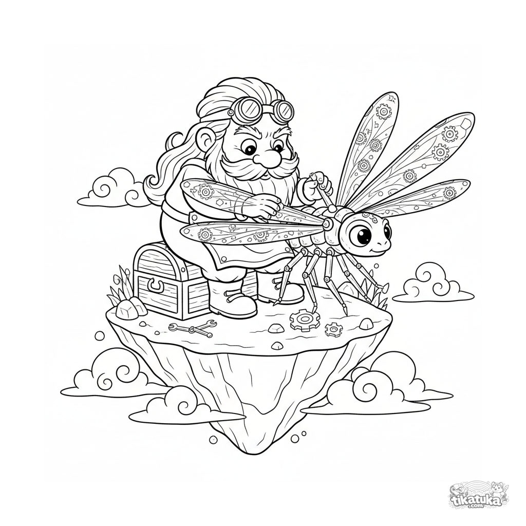 Coloring page for tweens 7-9: a gnome engineer on a floating island tinkers with the wings of a mechanical dragonfly, surrounded by tools and clouds.