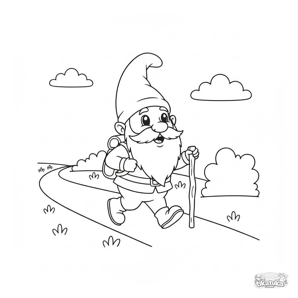 Coloring page of a cheerful gnome walking a path with a backpack and walking stick. Large details are perfect for toddlers ages 2-4.