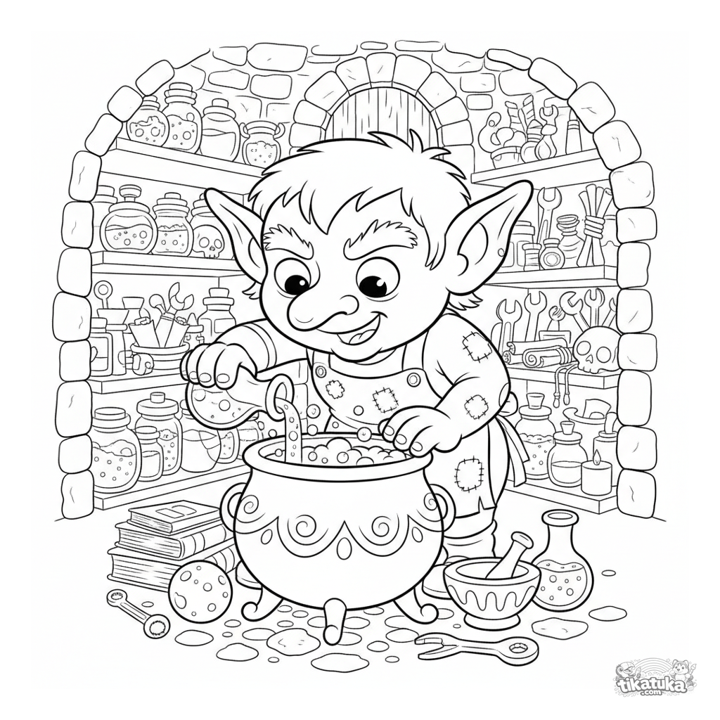 Coloring page for tweens 7-9: a goblin alchemist creates a magical potion in his cluttered underground workshop. A fun, detailed scene in a 90s cartoon style.