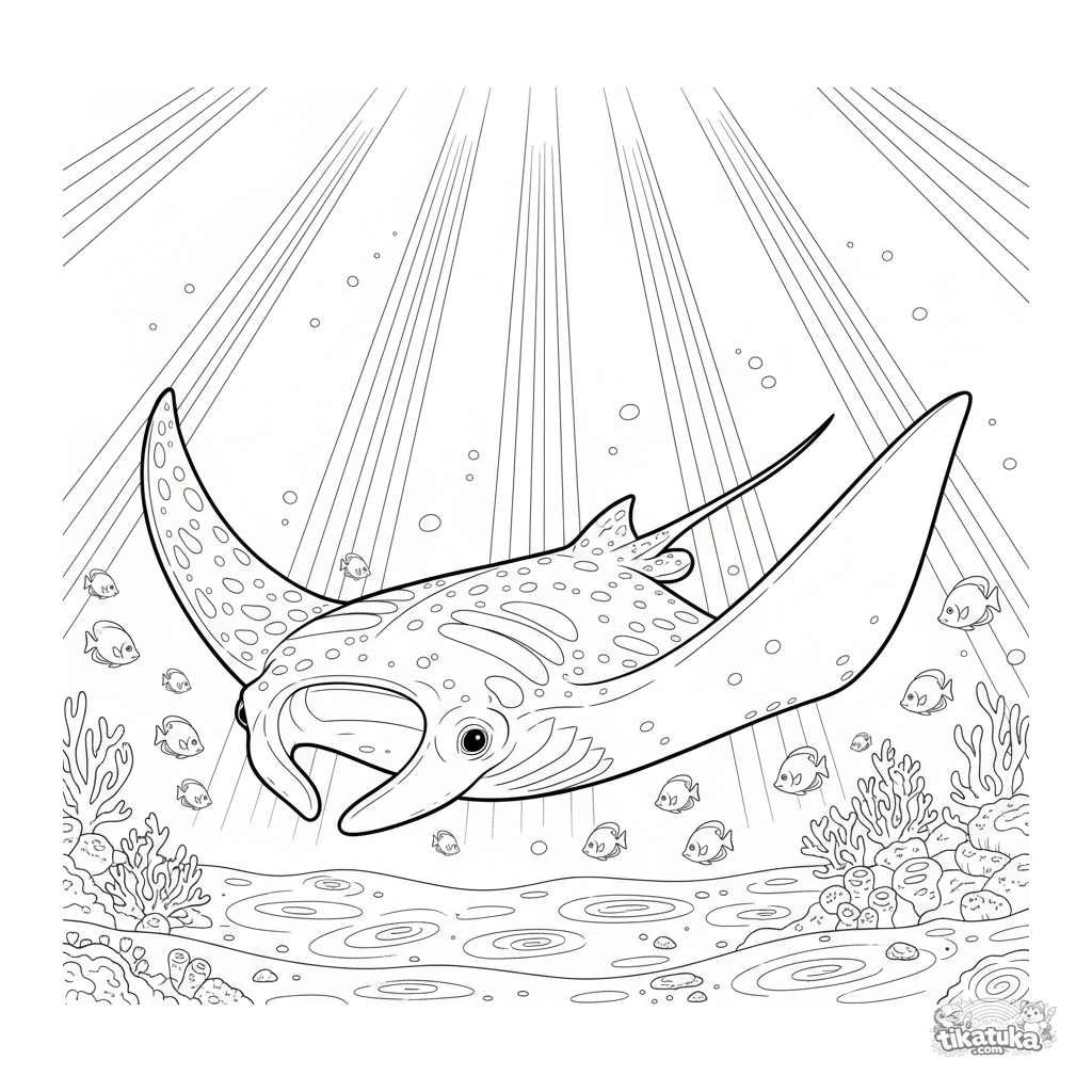 Complex coloring page for ages 10-12: a majestic manta ray glides through pillars of sunlight in shallow water. A detailed scene with anatomical accuracy.