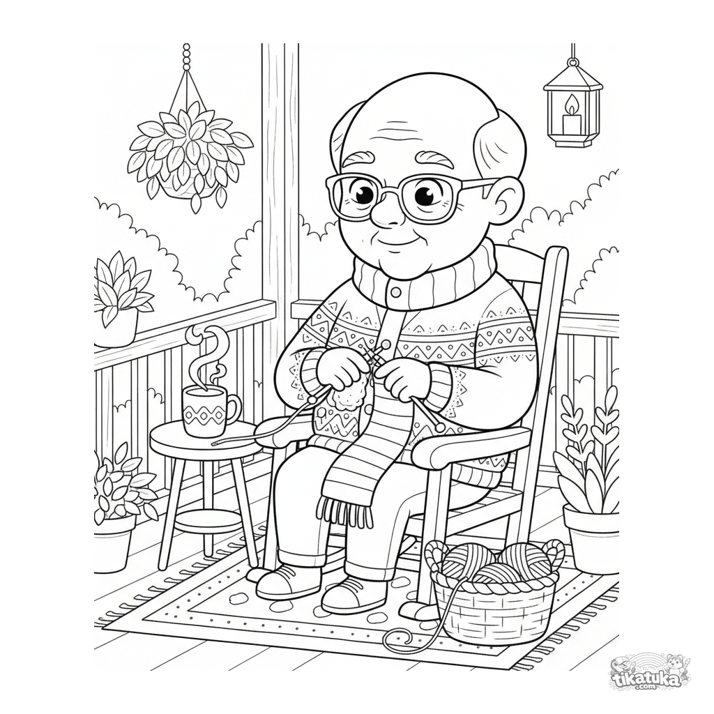 Detailed coloring page for older kids 10-12: a grandfather knits in a rocking chair on a cozy porch. Rich detail, textures, layered scene.