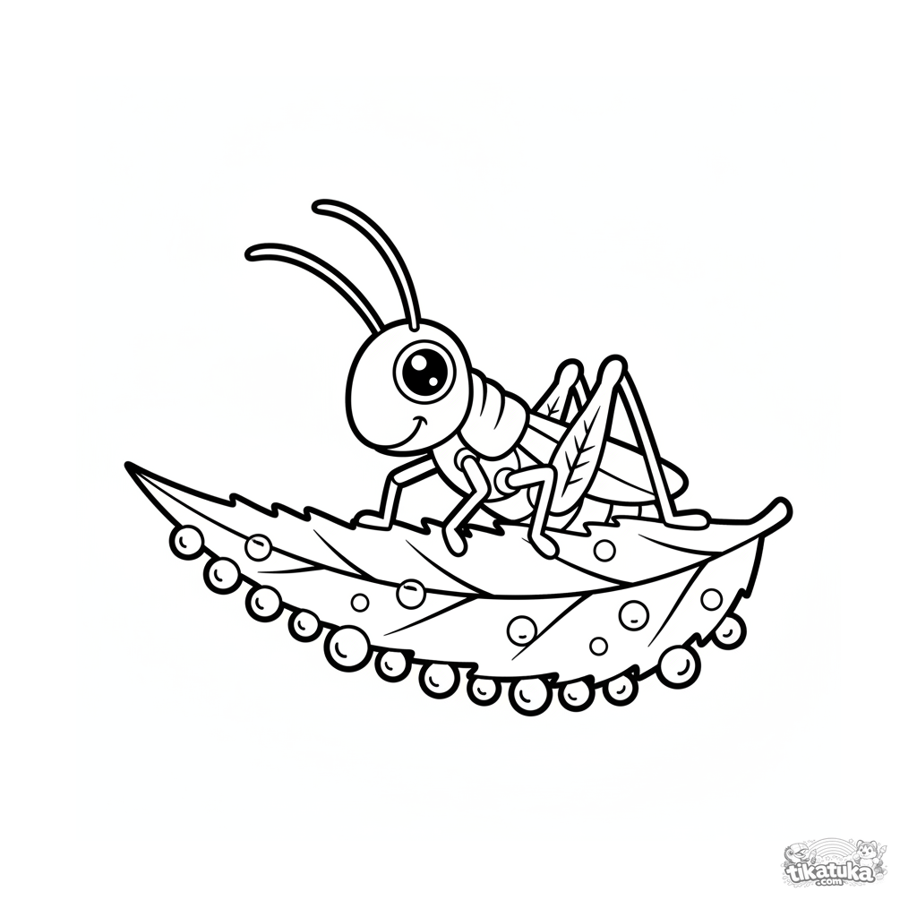 Simple coloring page for toddlers 2-3: a grasshopper in a fun 90s style plays peek-a-boo, looking out from behind a curtain of dewdrops on a leaf edge.