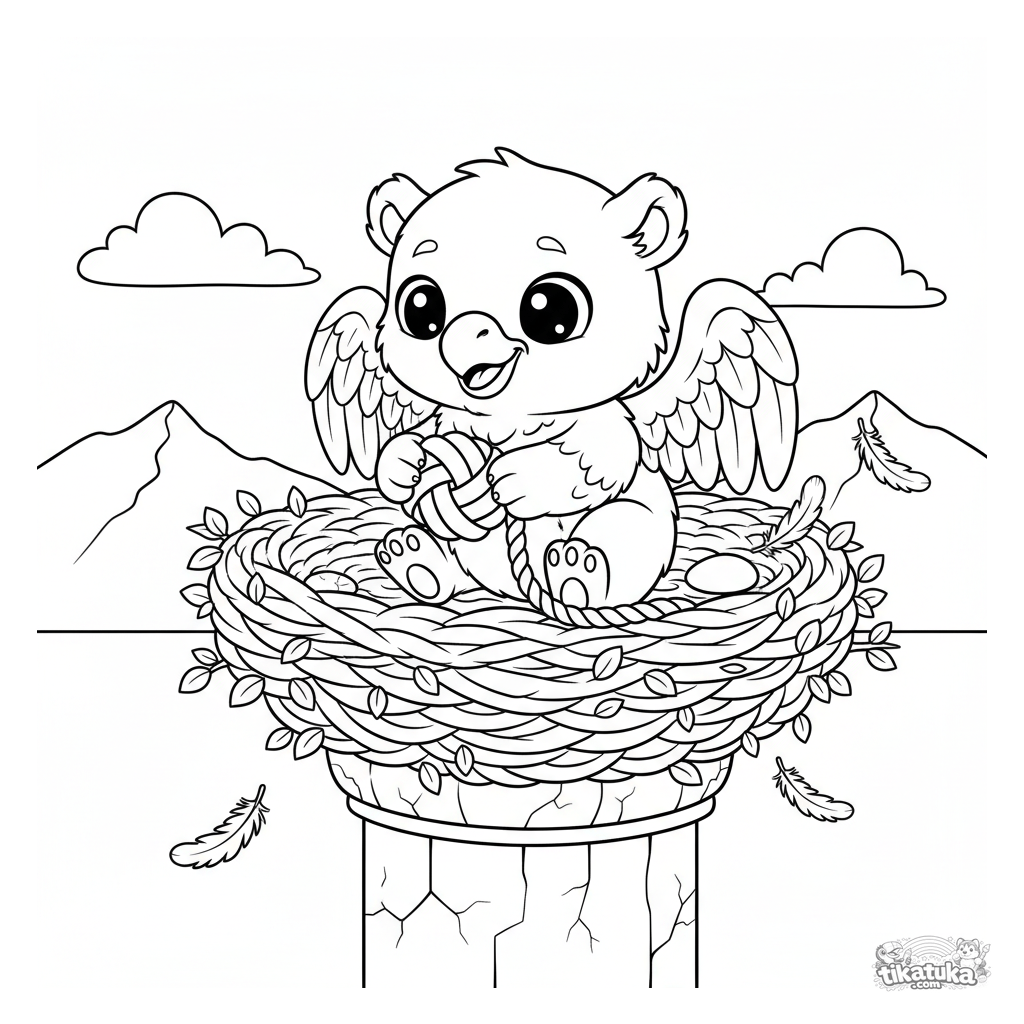 Coloring page of a cute griffin chick playing with a rope toy in its nest on a stone pillar. For kids 4-6, cute chibi style.