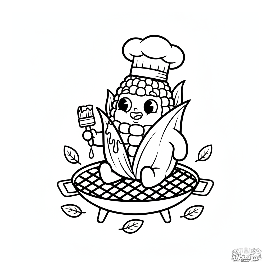 Coloring page of a grilled corn cob for kids 4-6. A happy cob in a chef's hat cooks in the garden.