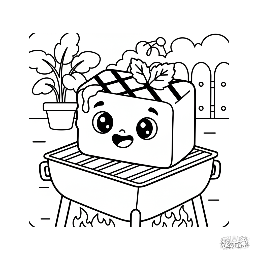 Coloring page of grilled halloumi cheese in a garden. With a mint garnish. For kids 4-6. Clean geometric shapes, paper-cut style.