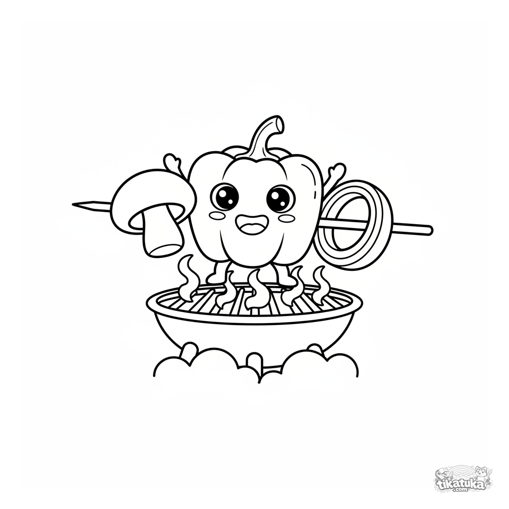 Simple coloring page for toddlers 2-3. A cheerful pepper on a skewer dances on a garden grill. Large shapes, few details.