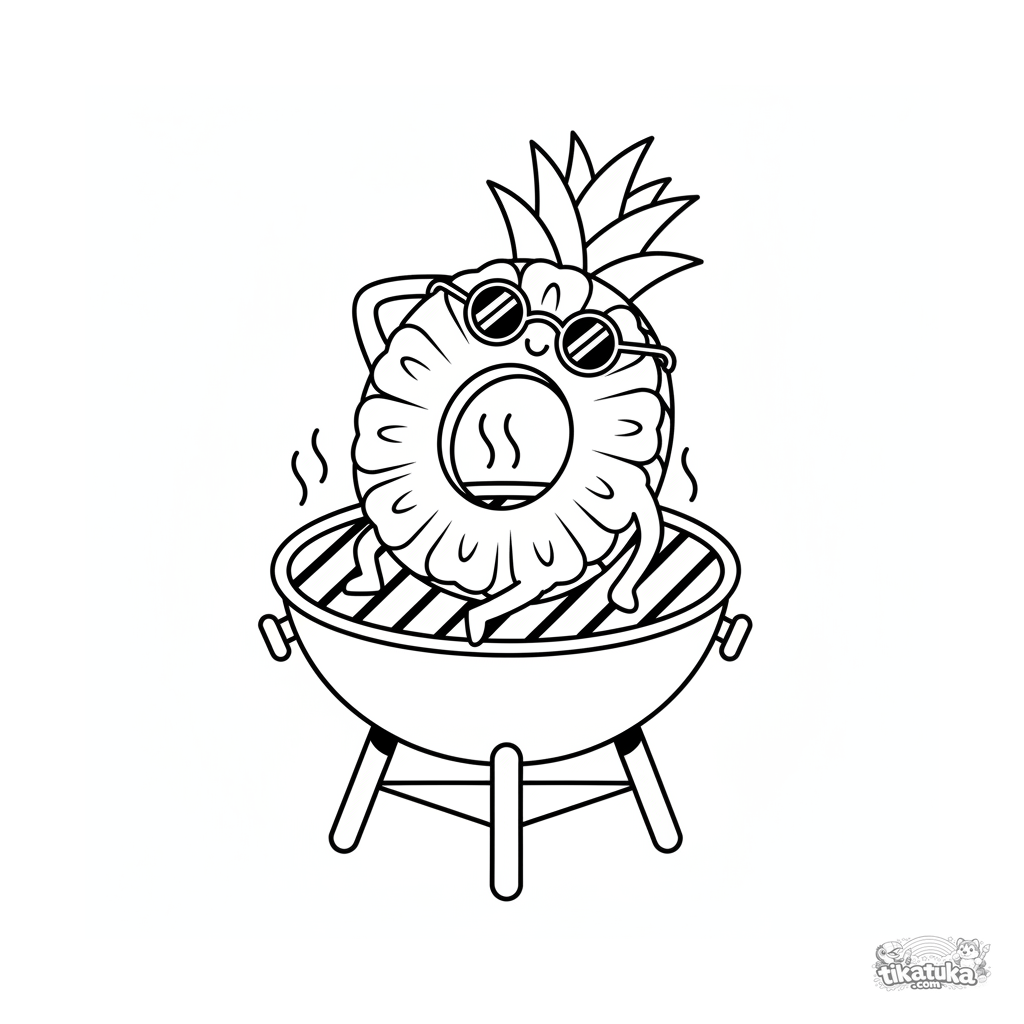 Simple coloring page for toddlers 2-3: a pineapple ring wearing sunglasses sunbathing on a grill. Large, clear shapes with wide margins for easy coloring.
