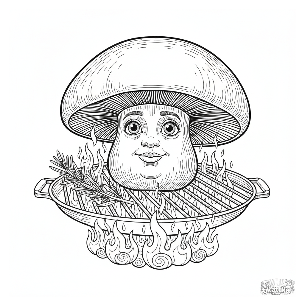 Detailed coloring page of a grilled portobello mushroom in a garden. Vintage engraving style. For older kids 10-12. Textures, cross-hatching details.