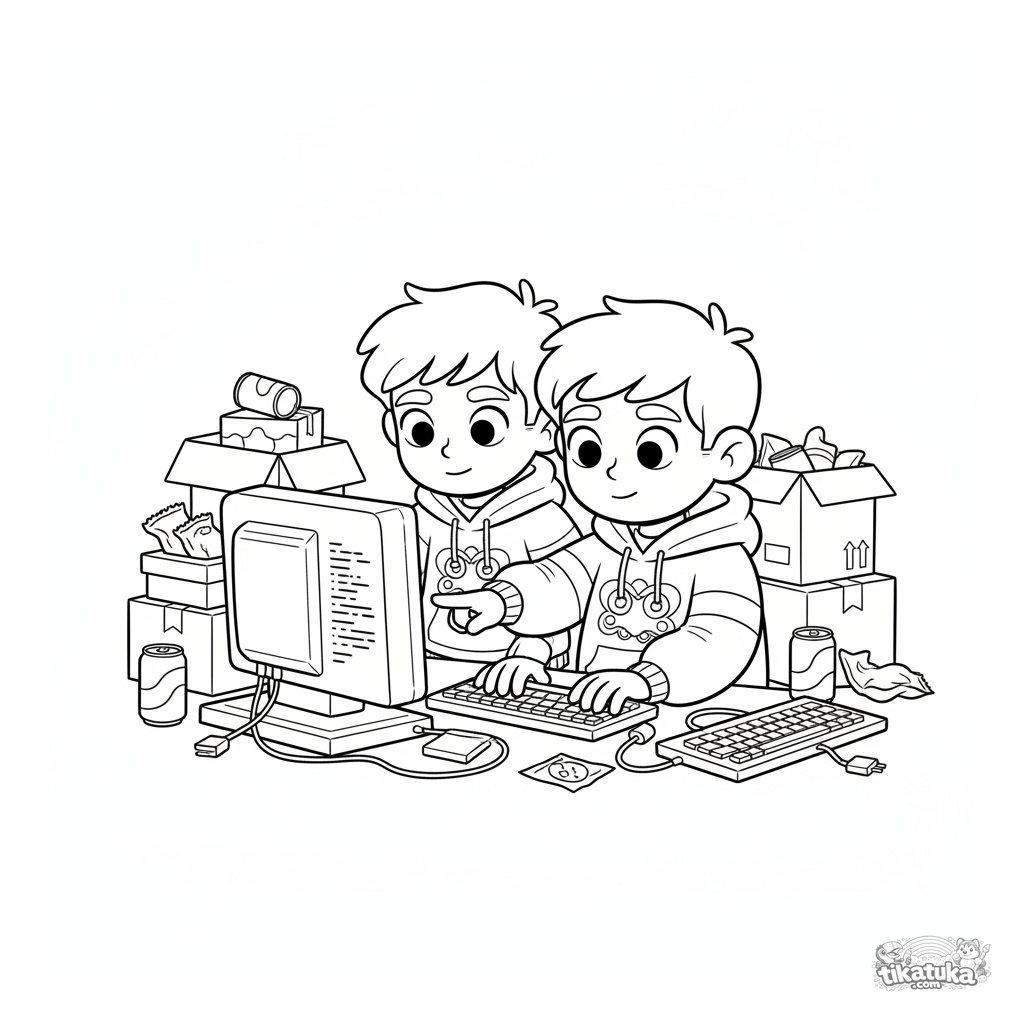 Coloring page for kids 10-12: two hackers working at a retro terminal in a basement. Detailed scene with cables, keyboards, cans. Encourages focus.