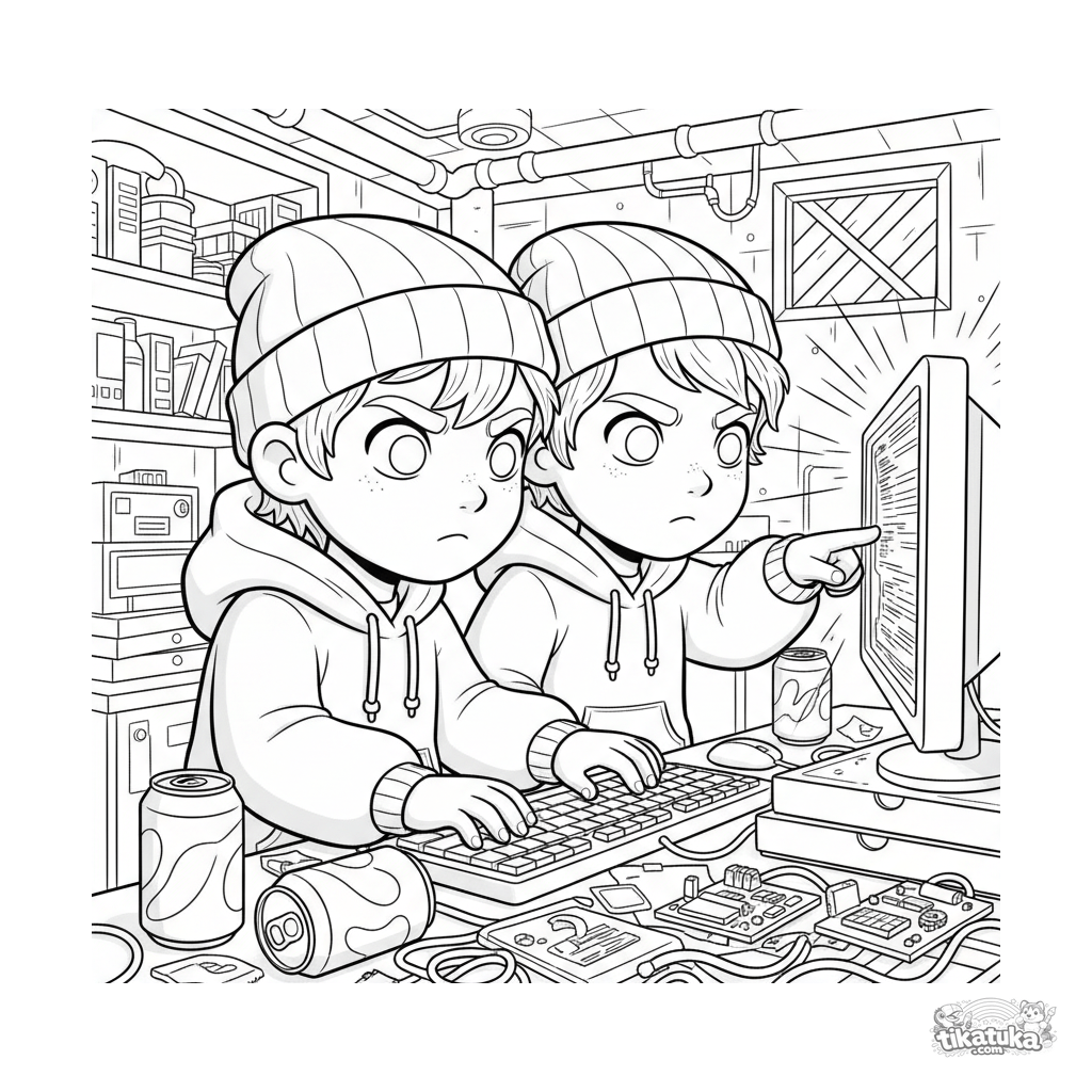 Coloring page for kids 10-12: a hacker duo working at a terminal in a basement. Detailed scene with cables, screens, and cans. Encourages attention to detail.