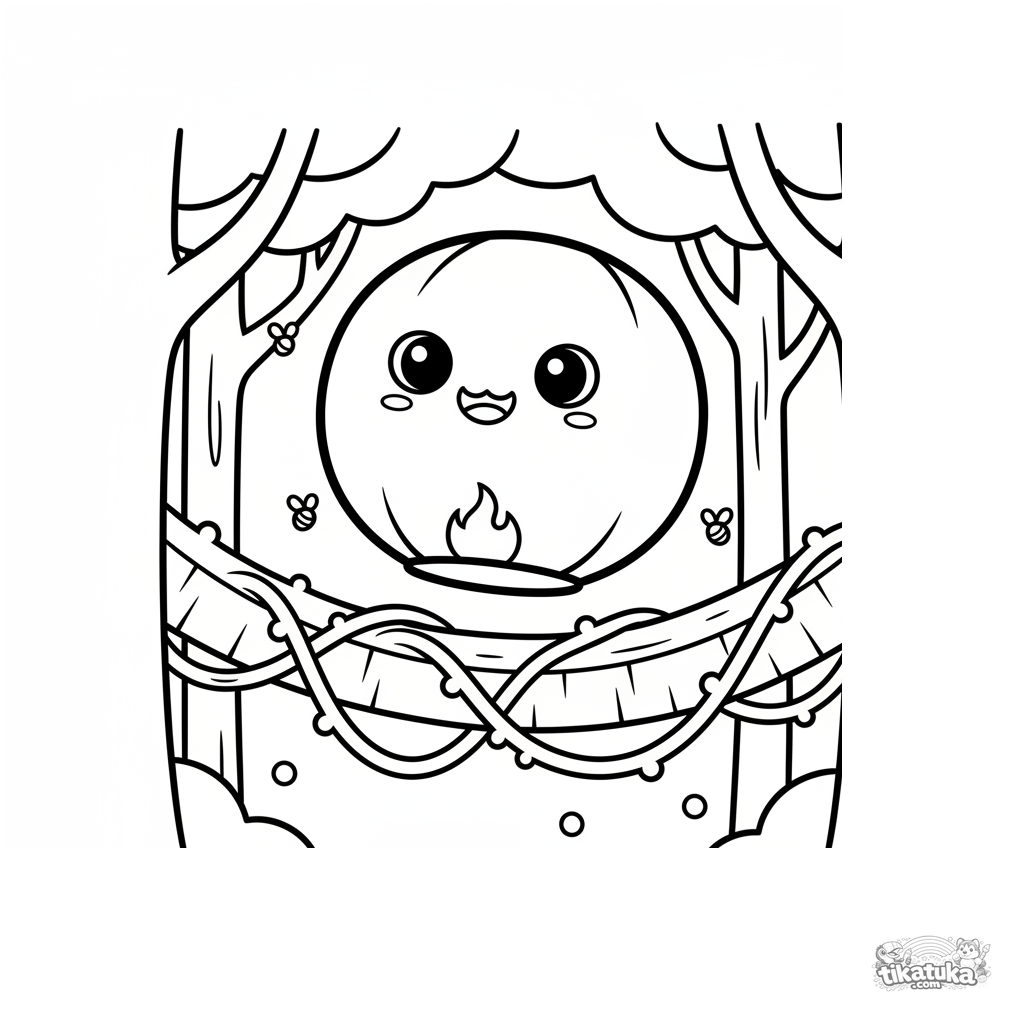 Simple toddler coloring page: a smiling lantern spirit floats along a bridge of glowing vines in a magical forest. Large shapes, wide margins.