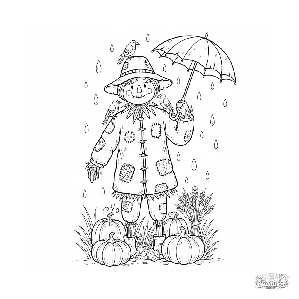 Coloring page for older kids 10-12: a friendly scarecrow with an umbrella stands in a harvested field under autumn rain, with pumpkins and crows.