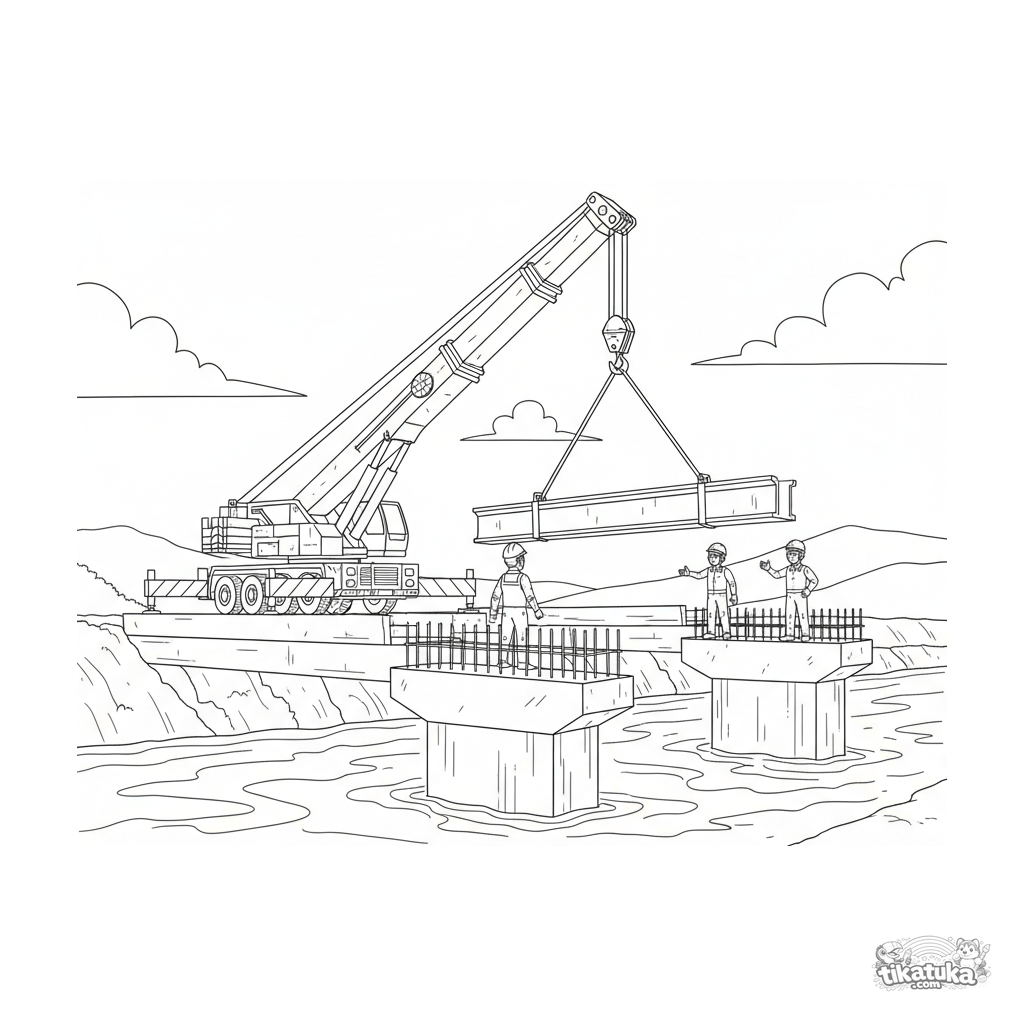 Detailed coloring page for boys 10-12: a powerful crane truck involved in building a bridge over a river. Technical blueprint style.